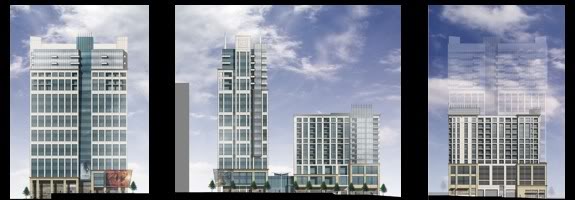 There is some really good discussion going on over at the Urban Planet Forums over Site 1, a development project going up on Fayetteville St. These pair of towers are planned to be built across Fayetteville Street from the new Marriott Hotel. Currently, the site is being used as a staging area for the hotel and new convention center, so naturally no construction on Site 1 has started. While the City has approved Site 1 over and over again, new renderings have been brought up that change the design, slightly. Below are the new renderings that can be found on the Craig Davis Properties website.