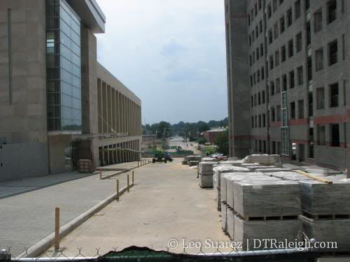 The future Cabarrus St. looking west from Salisbury St. Cabarrus is the southern anchor of the warehouse district so this street re-opening will be crucial.