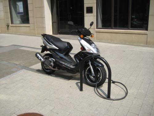 Yay, that’s my scooter! To my cyclist friends – sorry I’ve been hogging the rack at Hargett/Fayetteville, but it sure beats $10/day parking + gas!! In all seriousness, the city had the right idea by installing the bike racks on Fayetteville Street, but these racks are not big enough for all of the riders in the area. We need more racks and, more importantly, we need to start paving roads wide enough to include bicycle lanes so that cyclists don’t have to worry about getting run off the road by impatient Triangle drivers. I ride a scooter instead of my bike to work because biking downtown during the week can be downright dangerous; at least on the scooter I can keep up with traffic.