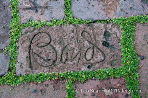 Prison labor, referenced on the marker, was used to build the executive mansion, including the brick sidewalk on the edges of Burke Square. Gang leaders left their names on bricks used in construction of the sidewalk and you can still see the names today. Here is an example of one on the block’s north sidewalk.