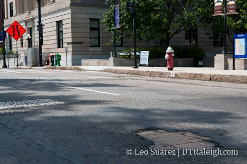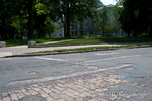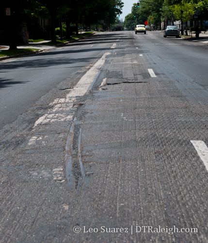 Edenton Street is currently being repaved. With the top layer of asphalt stripped away, some Raleigh history has been revealed. Take a look at the photos posted below and you’ll see some of the old streetcar tracks that once rolled from the capitol down Blount Street.