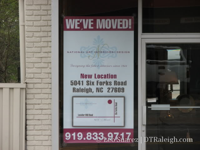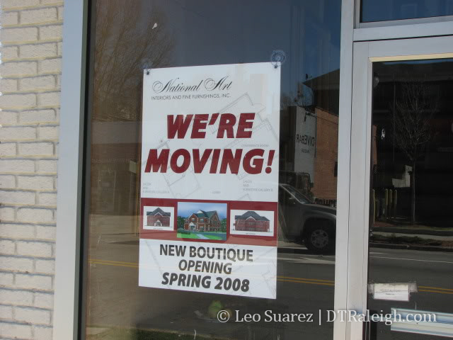 I heard this rumor and walked by this weekend to see if it was true. National Art Interiors will be moving from their location at 530 Hillsborough St. Unfortunately I could not go in and ask for more details; I was there on Sunday and they were closed. If any news pops up about a new tenant for this prime location, I’ll update this post.