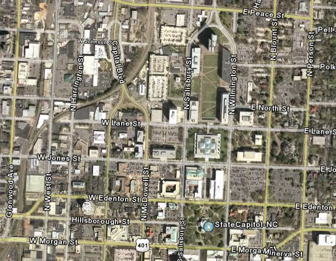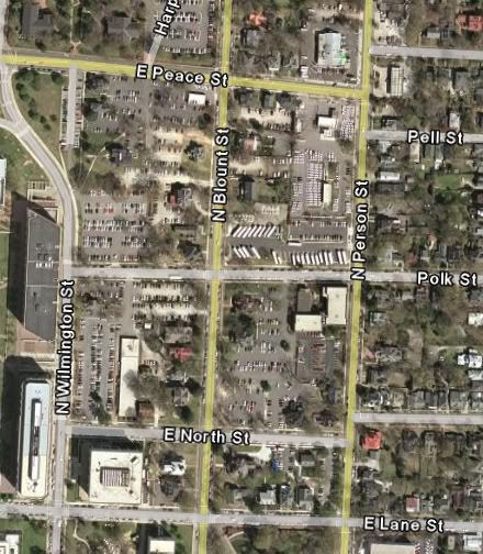 The area might not be as popular as the other livelier areas of downtown, since it is shadowed by most of the government buildings that become a ghost town at night and on the weekends. These two maps below show the area I’m talking about. There are 6 blocks around Blount St. that represent the target area. You can see on the map below that the area is very close to the Glenwood South and Fayetteville St. (south of the capitol building) districts. The area is also south of Peace College, West of Oakwood and Mordecai neighborhoods, east of the Government complex, and North of the downtown core. It is obvious that this is an important area to downtown Raleigh.