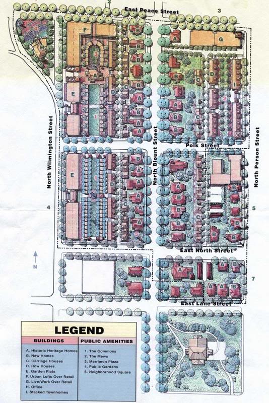The overall plan is shown in the following map. It includes revitalization of the historic homes along Blount St., filling in the empty lots with new homes, and selling them all to be used as residential rather than commercial. The area will also be filled with dense development including row houses, carriage houses, and flats. Some of the denser developments will include 3 or 4 story mixed-use buildings with on street retail. Wilmington and Peace St. will include the densest developments. I’ve also included some of the building renderings below.