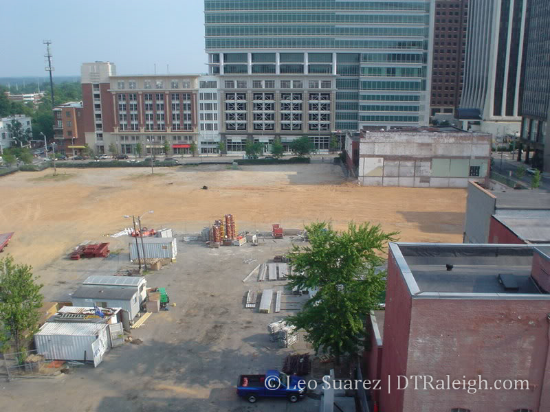 I took this picture looking south from the top floor of the Moore Square parking lot. The recent demolition on the four acre block, mostly owned by Progress Energy, has calmed down and there is nothing left but the corner buildings against Wilmington St. I do not think they stand a chance in the near future but nothing really has been announced for this area, except the parking deck,……or has there??