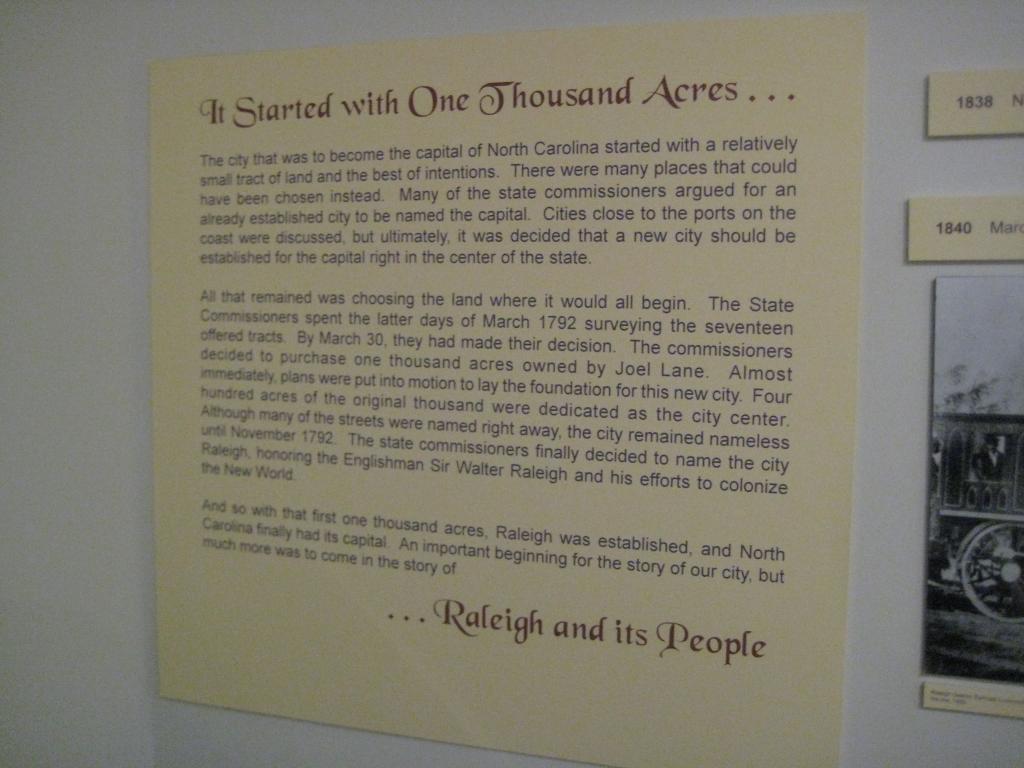 In 1800, the city of Raleigh only had 669 people. 200 years after that, the city has changed just a little bit. This city’s expansive changes and growth can all be seen at the Raleigh City Museum located in the Briggs Hardware building on Fayetteville St. This small museum has many photos and maps showing the growth of the city over time. The area we call downtown now is larger then the entire city of Raleigh at one point in time.