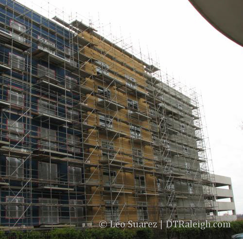 The Hue is moving along just fine. There is a ton of scaffolding on the exterior but one side is starting to show the yellow/blue/gray colors that will cover the building. The ground floor retail space is a big welcome to this area. The parking deck looks complete so can we call a 2009 completion date? Maybe.