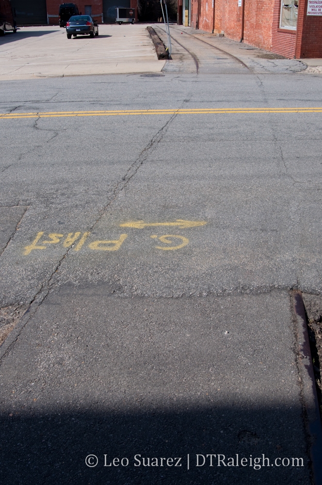 3. I find tracks all over the warehouse district poking out from behind buildings and also saw many from the street repavings, but also suspect there are some under the first block of New Bern Ave in front of the Credit Union. The gauge looks correct and the indentation is offset too much from the sewer manholes to be a sewer cut. Take a look sometime and see what you think….