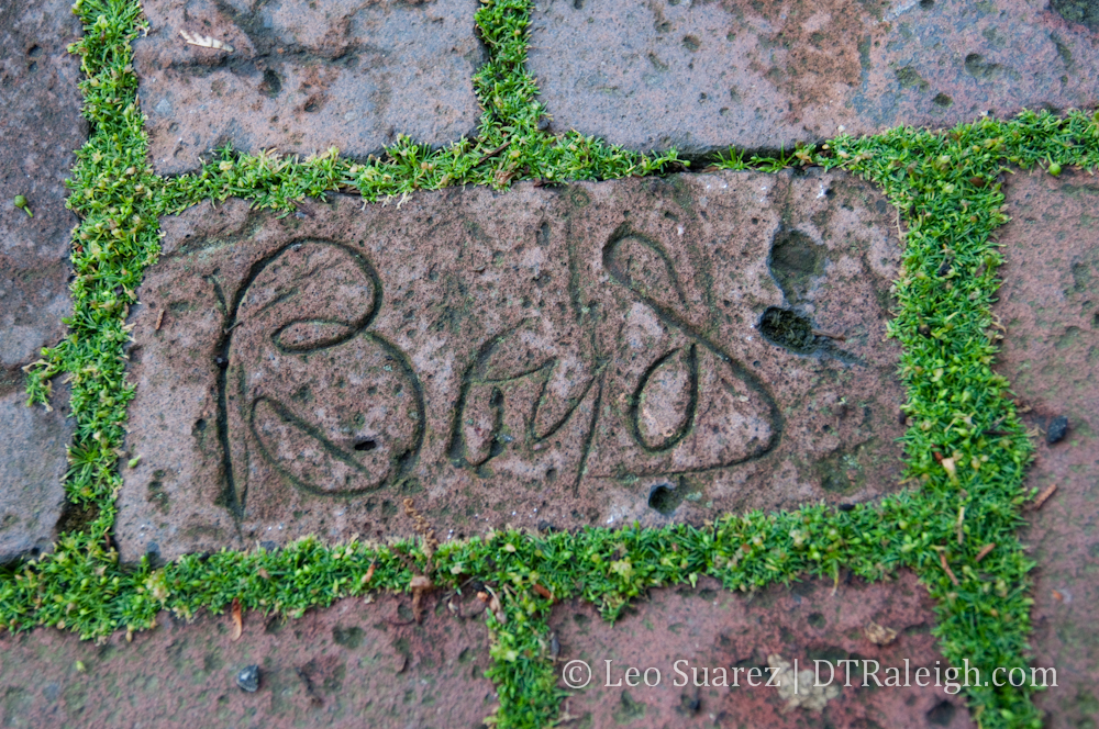 Prison labor, referenced on the marker, was used to build the executive mansion, including the brick sidewalk on the edges of Burke Square. Gang leaders left their names on bricks used in construction of the sidewalk and you can still see the names today. Here is an example of one on the block’s north sidewalk.