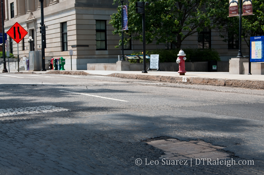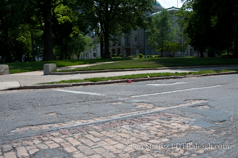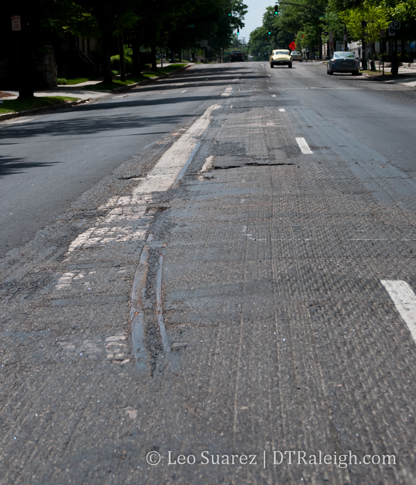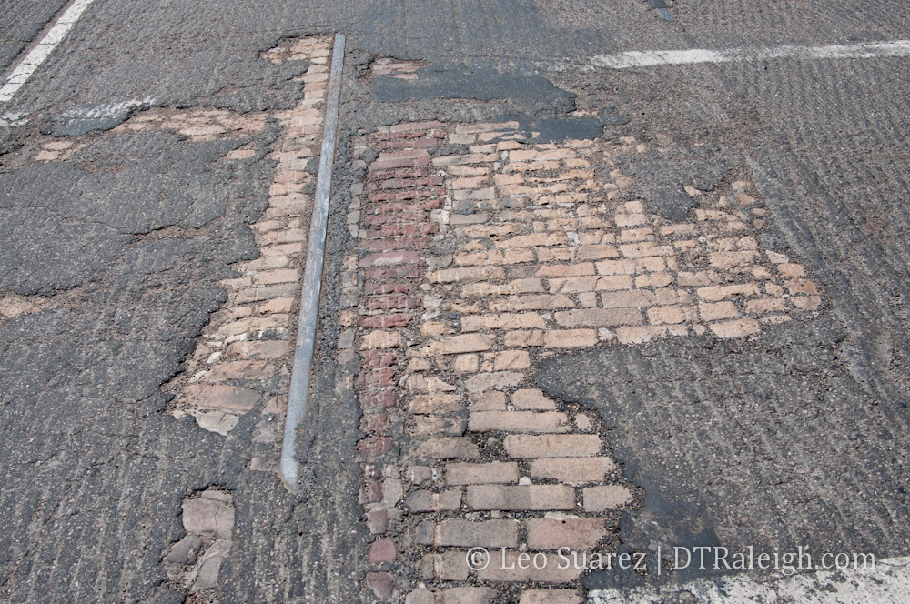Edenton Street is currently being repaved. With the top layer of asphalt stripped away, some Raleigh history has been revealed. Take a look at the photos posted below and you’ll see some of the old streetcar tracks that once rolled from the capitol down Blount Street.