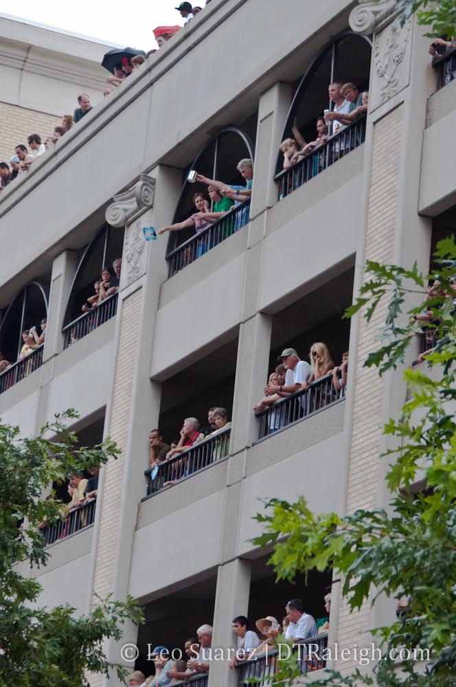 Crowds moved up to the Alexander Square parking deck to get a better view of the mototrials demo on Fayetteville Street.