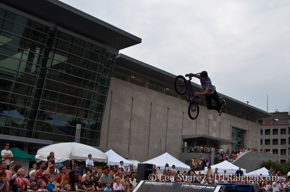 A stunt BMX biker flies off a ramp and performs a trick in front of a crowd outside the Raleigh Convention Center.
