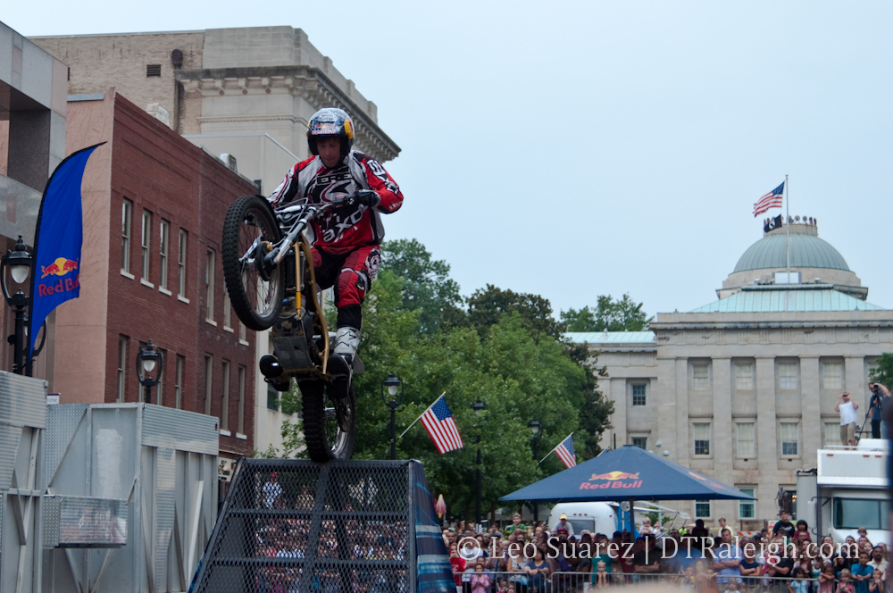 Motorcycle rider Geoff Aaron performs stunts around a course on Fayetteville Street.