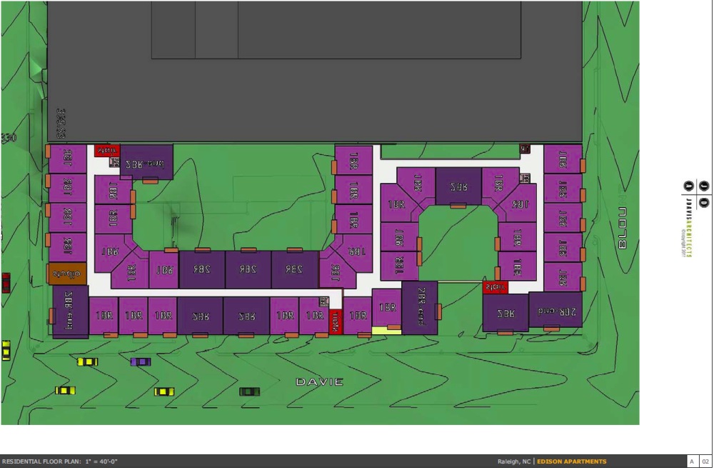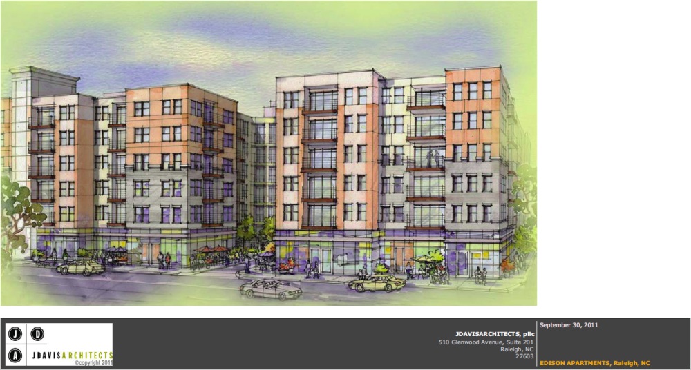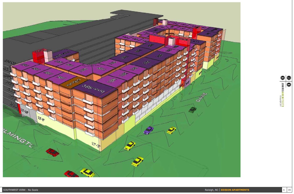 The original plan for the Edison block included taller office buildings, but the recession has reduced the likelihood for taller office building construction for the foreseeable future. Today, Edison is proposing the first phase of its Edison project to be a $30,600,000 239 unit 6 story high end residential community with 18,000 square feet of ground floor retail space. This project would be on the southern side of the block, bounded by Blount, Davie, and Wilmington streets.