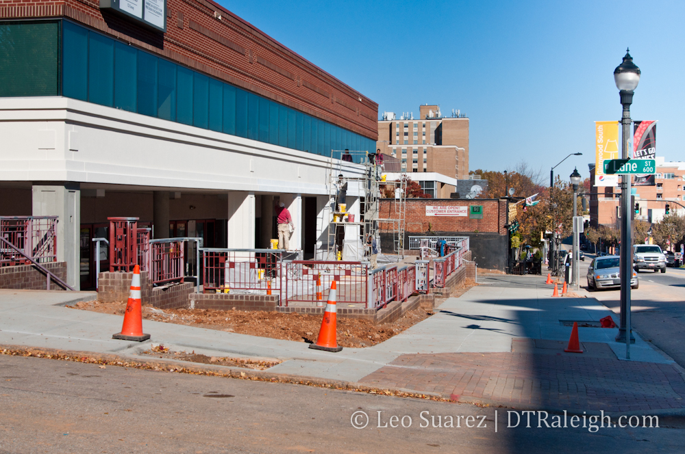 The 14 foot sidewalk requirement as part of the renovation initially held up the building’s owner from moving forward for many months. He finally relented when it became clear that the City’s Planning Department was not going to back down – Glenwood South being within a Pedestrian Overlay District. Existing businesses do not have to meet the new requirement, so people will have to “funnel” into the narrow 3 foot walking space in front of Hibernian next door.