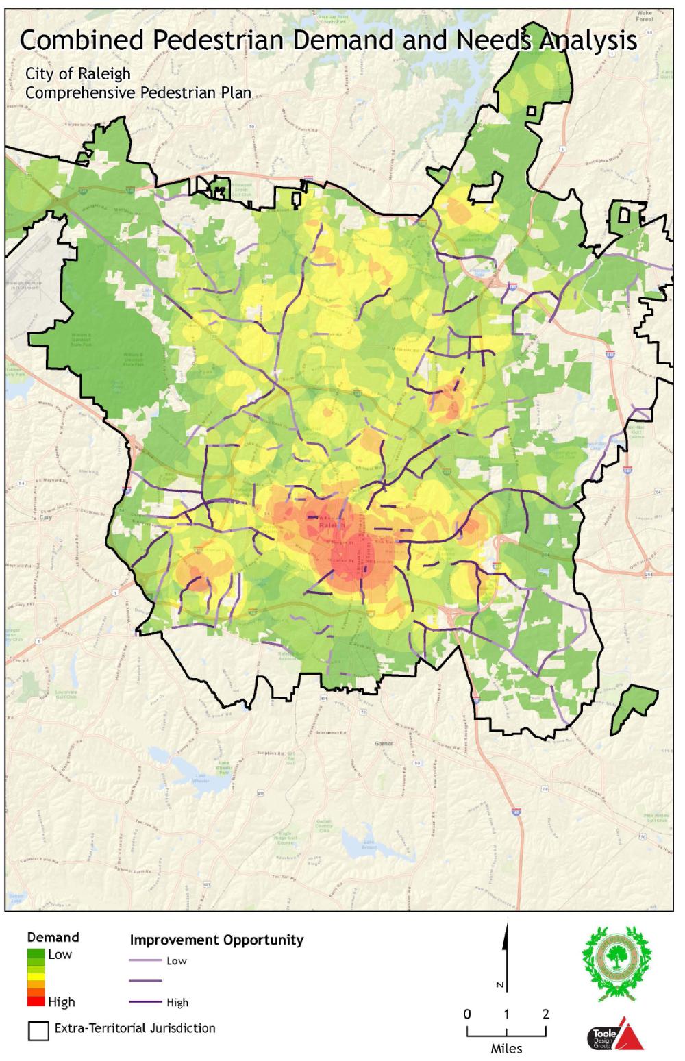 Anticipated demand for walking was calculated by the presence of certain things around the city. Things like higher population density and pedestrian generators (colleges and universities, tourist attractions, schools, transit facilities, etc.) are factors for measuring the demand for sidewalks and other pedestrian related facilities.