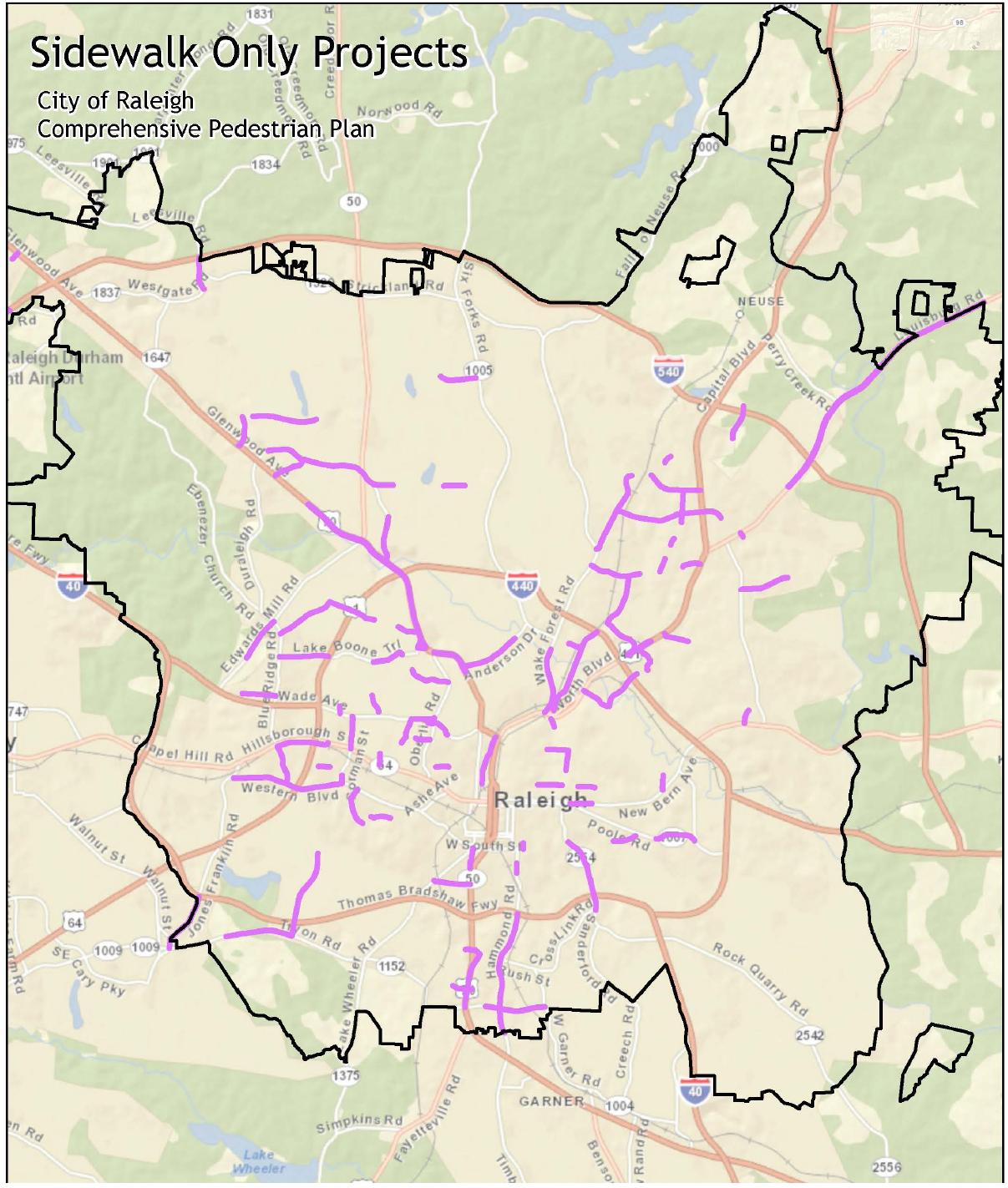Many Raleigh streets include a sidewalk on at least one side; however, sidewalks are missing on some streets and in many cases gaps limit the connectivity of the sidewalk network.