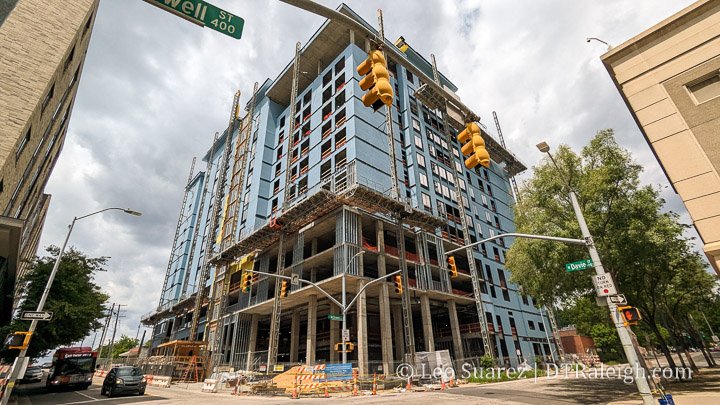 Things are moving along nicely at the corner of McDowell and Davie Streets where downtown Raleigh’s next hotel will open. The Tempo by Hilton and Homewood Suites Raleigh Downtown, a dual-brand hotel, will have about 260 rooms.
