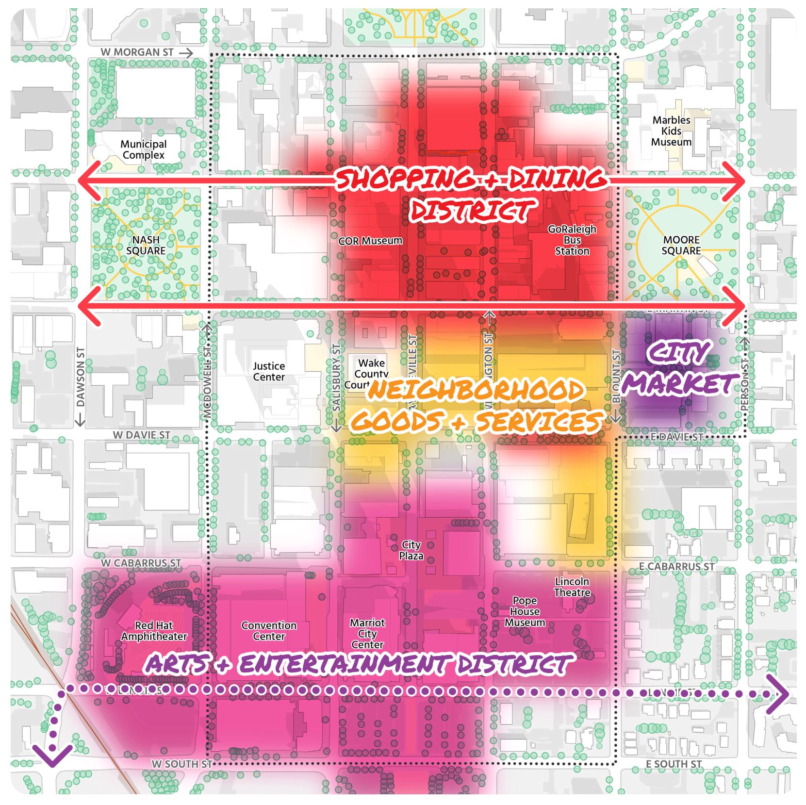 Of course, I’ll be following these projects and keep the updates rolling over the next few years. Today, what I wanted to post is the idea of branding this area as some kind of convention district. I think this could be helpful as a way to show people that this is where events and conventions take place, not where you go to really get a taste of Raleigh. I’m borrowing this from the recent Fayetteville Street study that was released back in Feb 2024 and I thought this graphic was pretty impactful.