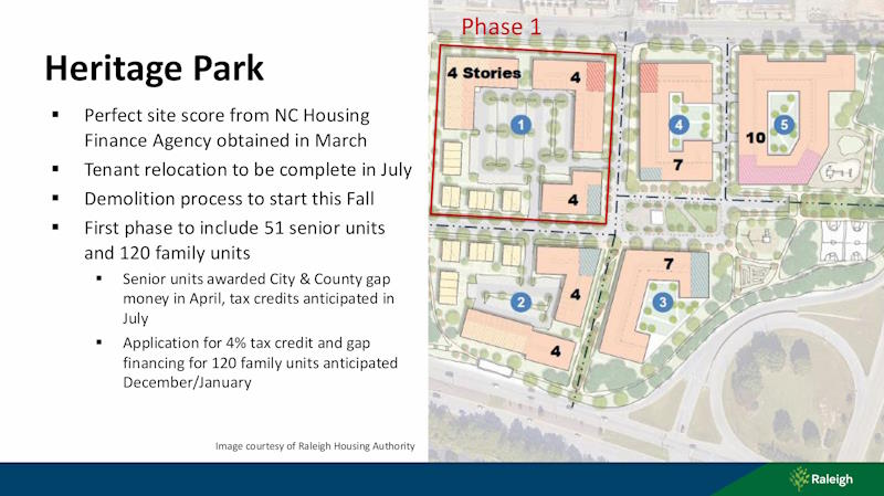 The Raleigh Housing Authority is working to add more houses in Heritage Park and the slide shown above indicates the phases, indicated by the blue-highlighted numbers, of the transition from the old buildings to new. While some phases may need some more work and a possible rezoning, this project aspires to get almost 1,000 houses here on this property.
