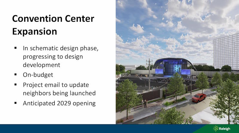 Nearby, the Convention Center Expansion, planned for the current location of the Red Hat Amphitheater, does have a schematic design that is on budget and plans to now move into the development design phase. Renderings of this were mentioned to be delivered later this year. The plan is to have this new convention center up and running in 2029.