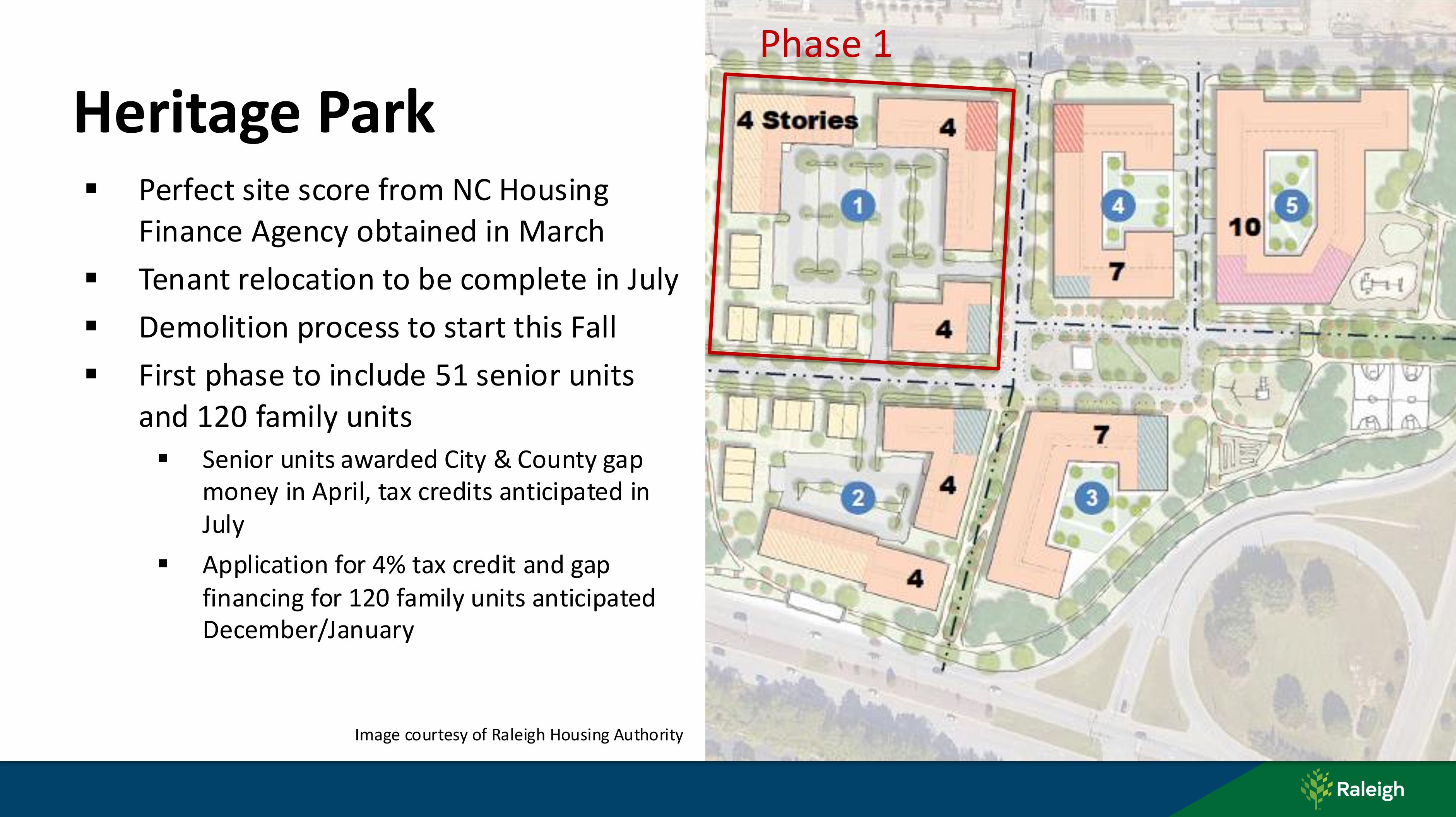 The Raleigh Housing Authority is working to add more houses in Heritage Park and the slide shown above indicates the phases, indicated by the blue-highlighted numbers, of the transition from the old buildings to new. While some phases may need some more work and a possible rezoning, this project aspires to get almost 1,000 houses here on this property.