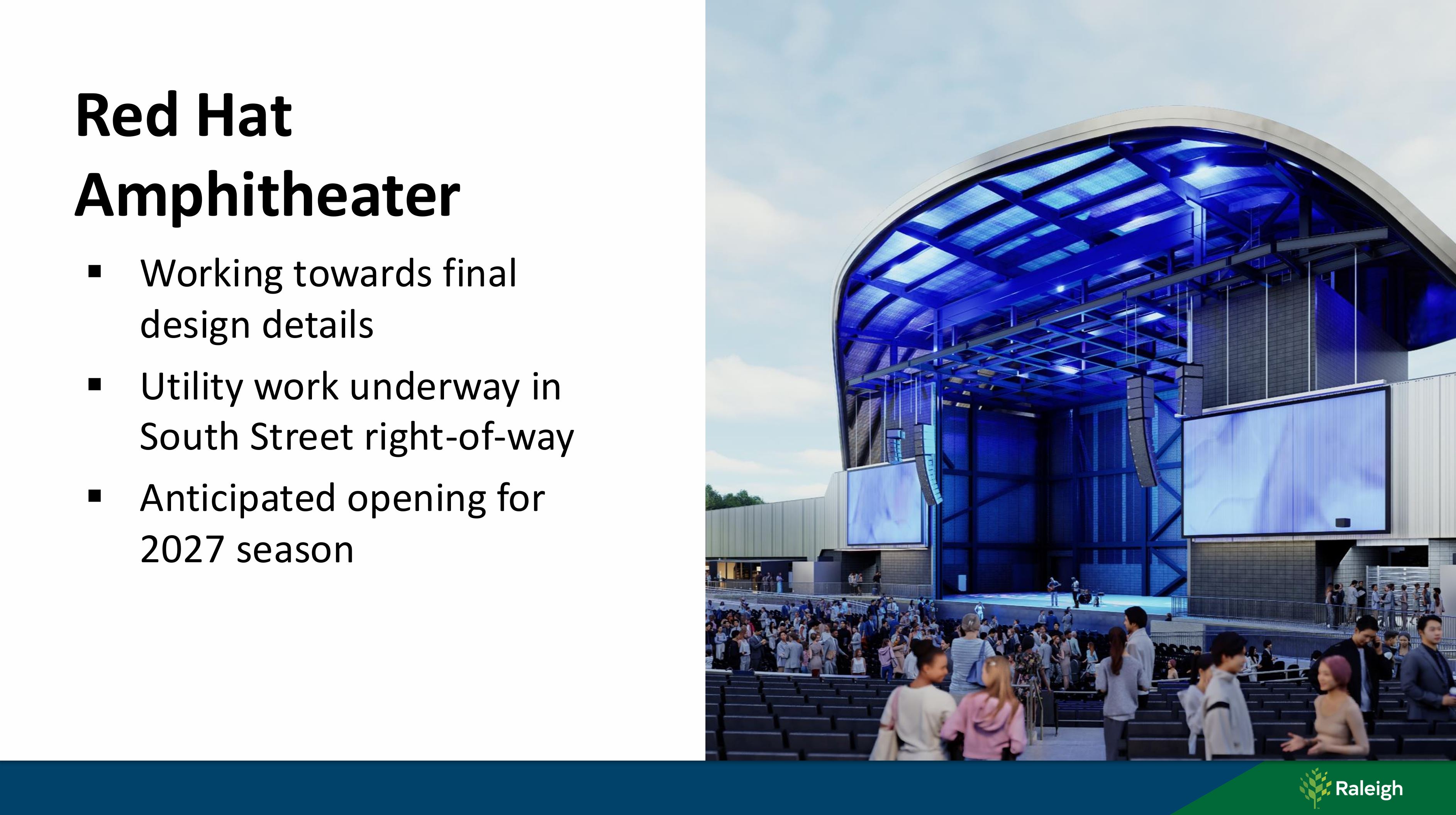 Nearby, the Convention Center Expansion, planned for the current location of the Red Hat Amphitheater, does have a schematic design that is on budget and plans to now move into the development design phase. Renderings of this were mentioned to be delivered later this year. The plan is to have this new convention center up and running in 2029.