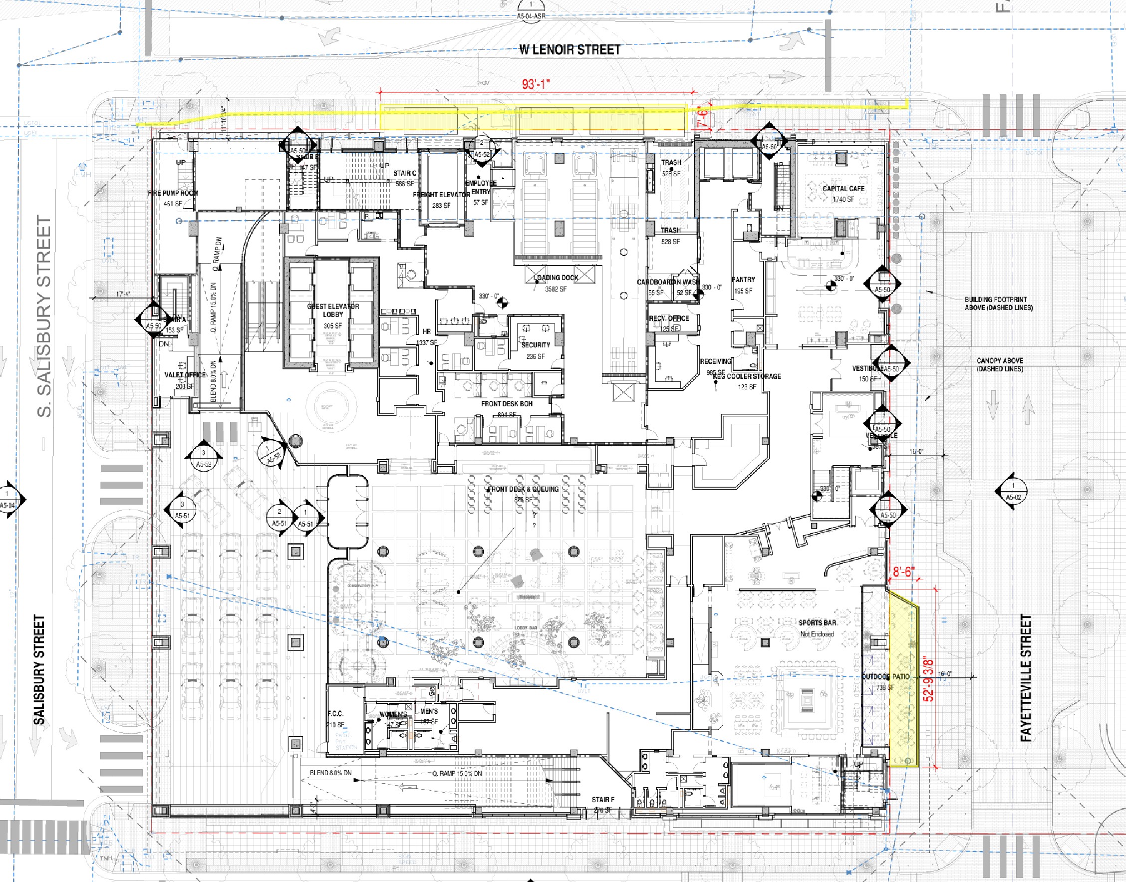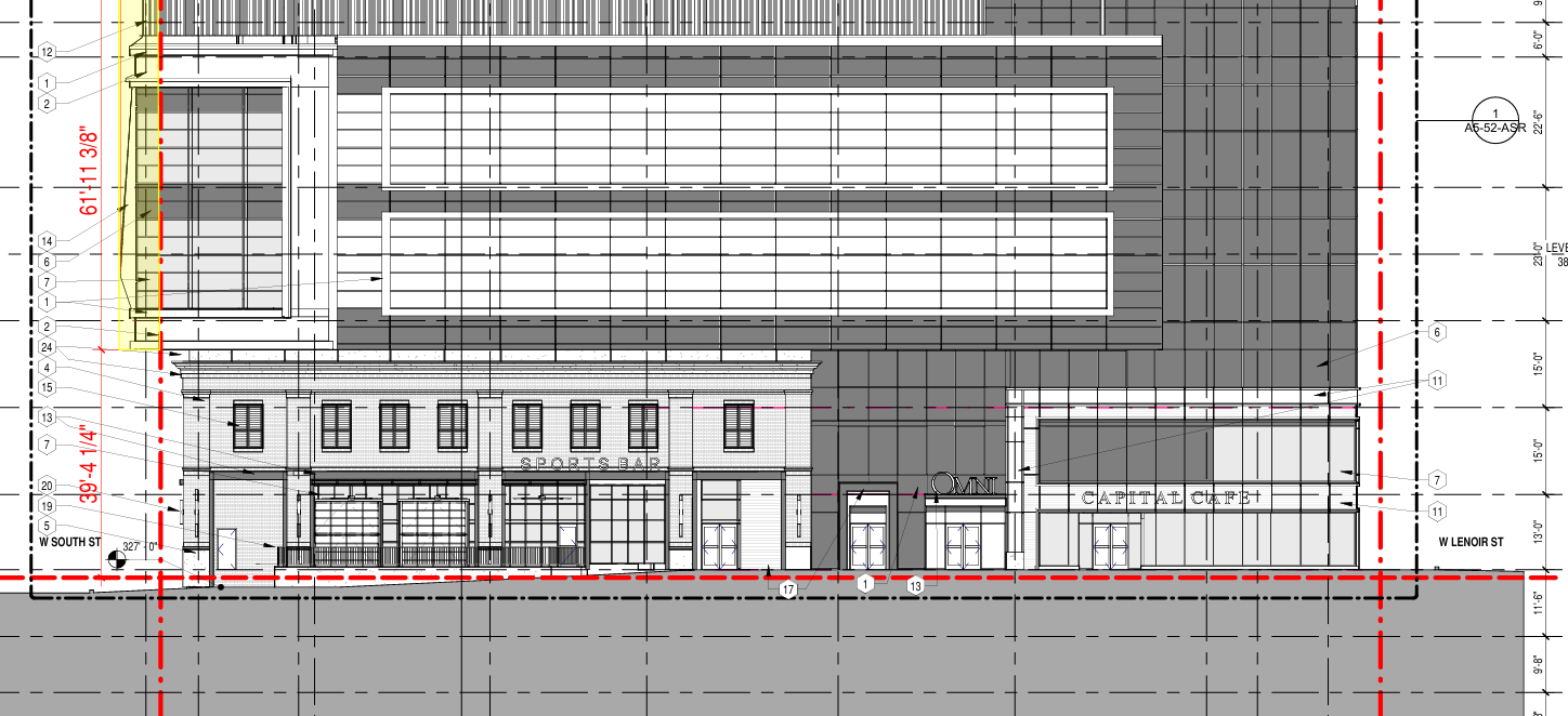 Salisbury will have the main vehicle entrance including the porte-cochère. It doesn’t look like there will be much else other than a blank wall and the walkways and driveways for visitors to come and go. I hope there’s some scooter and bike parking here too. I can imagine a visitor getting a ride from the airport, coming into downtown off I-40 onto Saunders, then approaching the Omni from McDowell, seeing the Red Hat Amphitheater, turning right onto Lenoir, admiring our Convention Center on the way (kidding) and then pulling into the Omni. We may need to work on this.