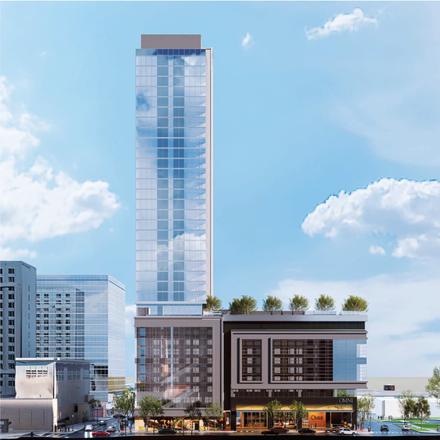 The Omni Hotel, planned for the southern end of Fayetteville Street, is going through the Design Review process. With that, we can peep some early plans to get an idea of what we’re getting at the street-level. There’s plenty here if you’re into proposed architectural plans of a building but I’m going to focus on the street-level elements and spaces. It’s a mixed bag from what I see but it’s probably what we should expect from a single-use tower focused mainly on visitors. Let’s take a look at each side and what the plans tell us at this point in time.