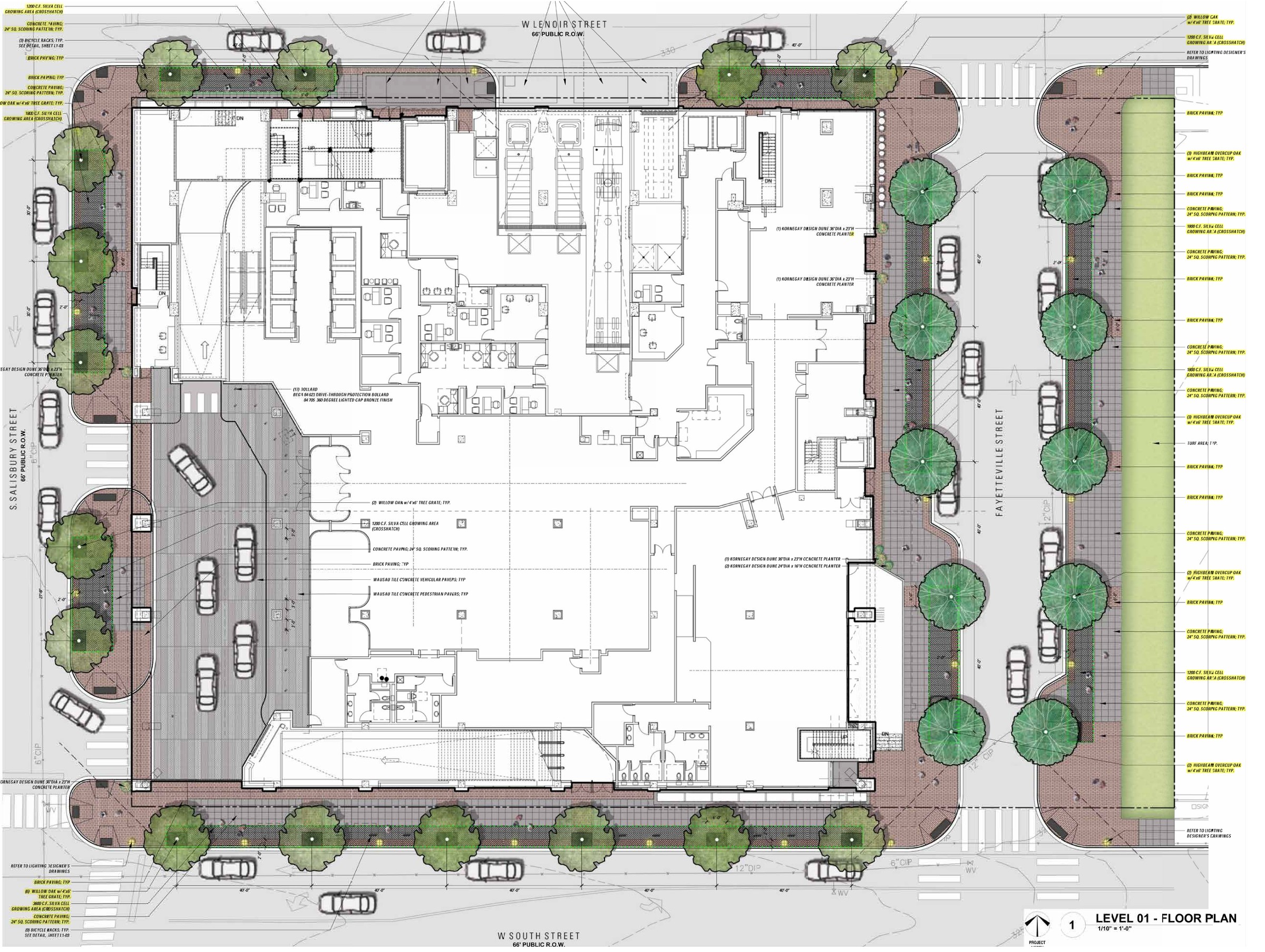 First, let’s start with some plans showing the first floor. We have a sidewalk plan and an interior plan below. What’s very exciting about this is that we also get a sneak peek at the new block of Fayetteville Street. Although I may be overreacting as we already know what it’ll look like. I would guess that the sidewalk style will match that of the existing street but I’m hoping for a change given the “this street is bland looking” vibes from the recent report. All that’s been covered here.