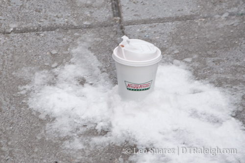 There are a couple gas heaters placed around the common area in front. Plus coffee from Starbucks or Krispy Kreme can be had from right across the street. Careful though, I heard one woman claim that the Krispy Kreme coffee is too hot. Refer to picture below for her easy solution.