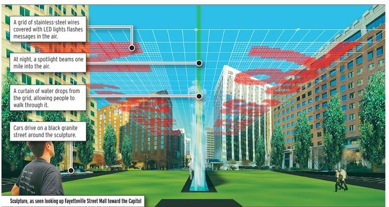 That same year, the Raleigh arts community was deep in another controversy, the Jaume Plensa Plaza proposal for the space that is City Plaza today. In early 2006, reports of his hiring to design a public plaza here in Raleigh were circulating. His design, shown below, for the space was bright with LED lights, moving with a wall of water, and open with a grassy field. Again, the grand vista of Fayetteville Street took priority and after the city council paid to create a mock up to see it for themselves, the project still was not going anywhere. Finally, the generous donation by Jim Goodmon of $2.5 million was pulled and that was the end of that. Read this article for a nice wrapup of the “fiasco”.