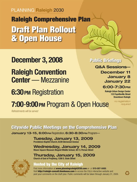 December 1 the Plan will be available for review and comment both on-line and at City of Raleigh offices and Wake County public libraries. A special website will allow anyone with an internet connection to comment on every policy and action statement in the Plan. Comments also will be accepted in any form that citizens may wish to use, from letters to phone calls. The comment period will be open from Dec. 1, 2008 through Jan. 31, 2009. During this time, the final three citywide public workshops will be held to provide another vehicle for input. Public briefings will be held to answer questions about the Plan.Register here for both the Draft Plan Rollout & Open House and Citywide Public Workshops