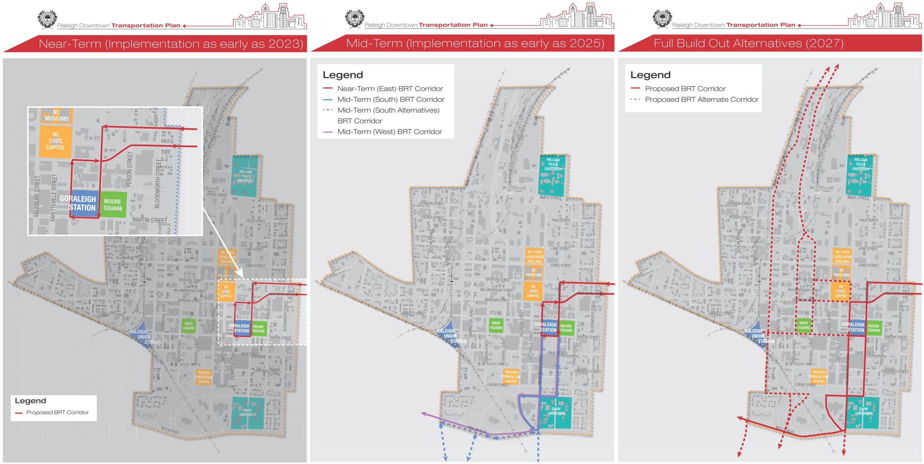 Mid-term, the BRT routes serving the west and south will come online connecting at GoRaleigh Station. The route down Western Boulevard is also most direct while a choice still exists for the routes to the south. Saunders, McDowell/Dawson, and Wilmington Street could all be possible entry/exit points to downtown. There are still two many outside variables that need to be determined so this has been left open.