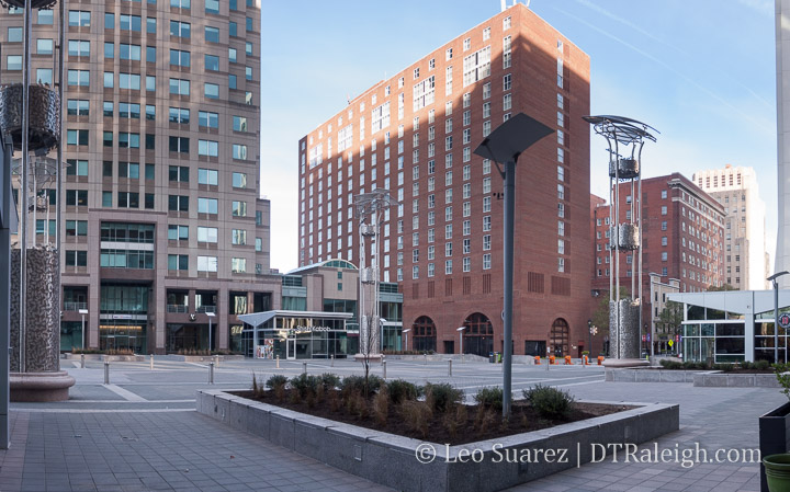 The pedestals for art are still blank so perhaps new pieces will be added sometime soon. That could help as the plaza is pretty lacking right now and is visually uninteresting. What’s needed are people and lots and lots of chairs!