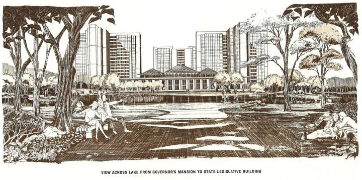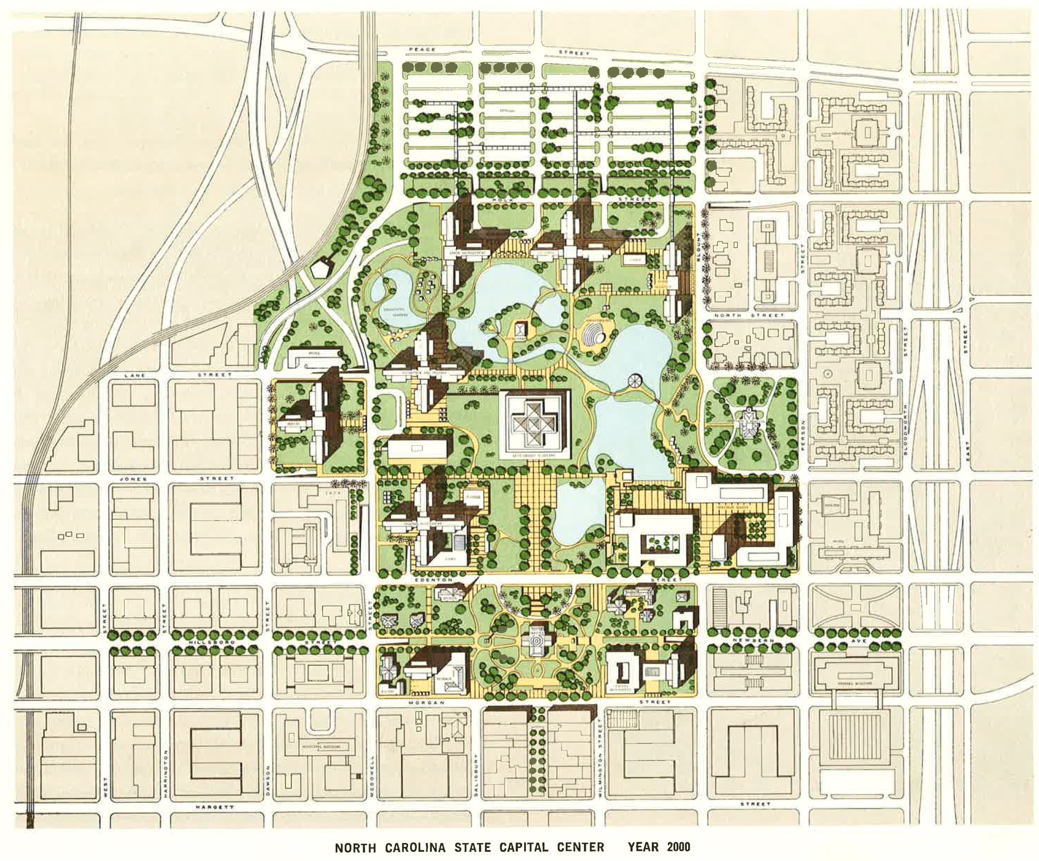 The State Capital complex vision was a pretty stark difference compared to what we have today. Instead of buildings and parking decks along a, more or less, urban grid, the vision involved something you would see in Research Triangle Park. (RTP)