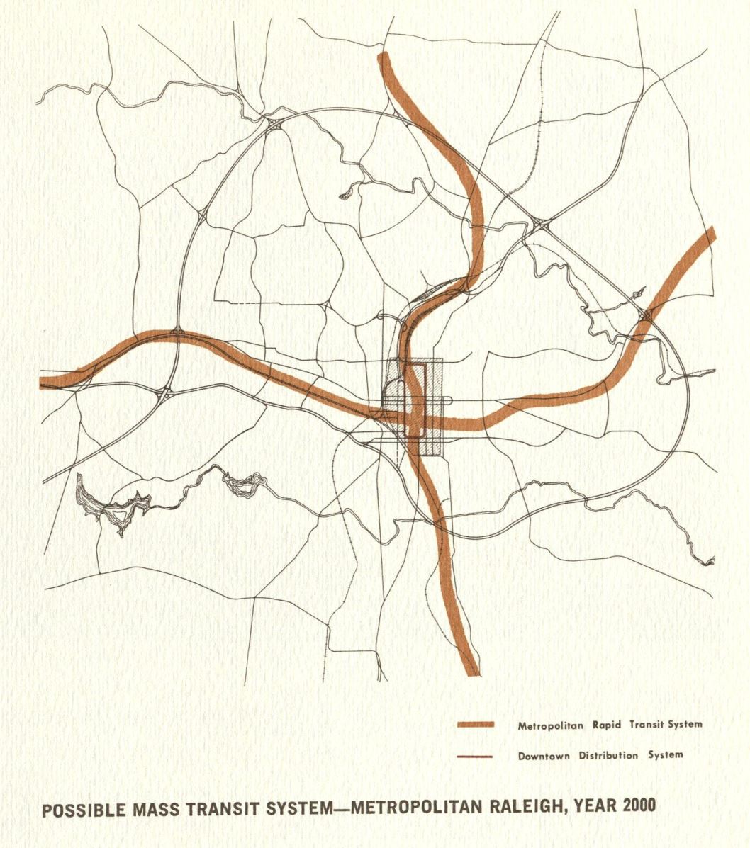 Attached to this section is a map of mass transit routes that may be possible in the year 2000. I can’t help but laugh a bit seeing this prediction as we are underway now planning a bus-rapid transit system along the very same lines drawn in each cardinal direction outward from downtown Raleigh.
