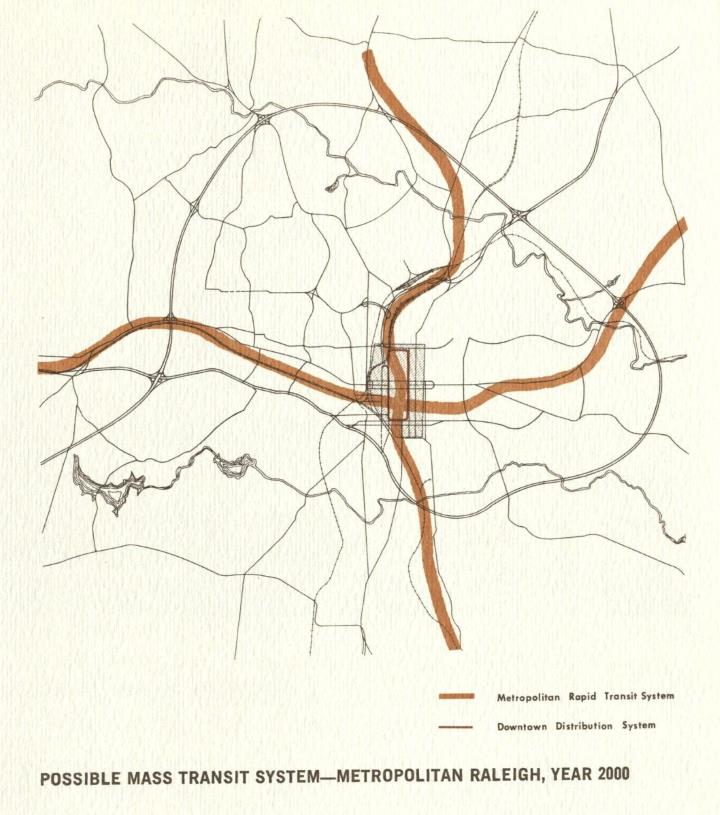 Although the automobile is now a prime means of transportation, this will not necessarily be true by the year 2000. Raleigh at present is heavily committed to the automobile and could not now exist without it. In the future, however, the prime means of access to the central city will probably be some combination of private vehicles and mass transportation. Although the foreseeable population levels and densities probably will not justify a rapid transit system, this possibility should be kept in mind. Concentration of employment as proposed in the State Capital Center plan is favorable to mass transit, and similar concentrations along corridors of travel may some day justify a means of transportation other than the automobile. The study now under way may well set some guidelines for the future in this respect.