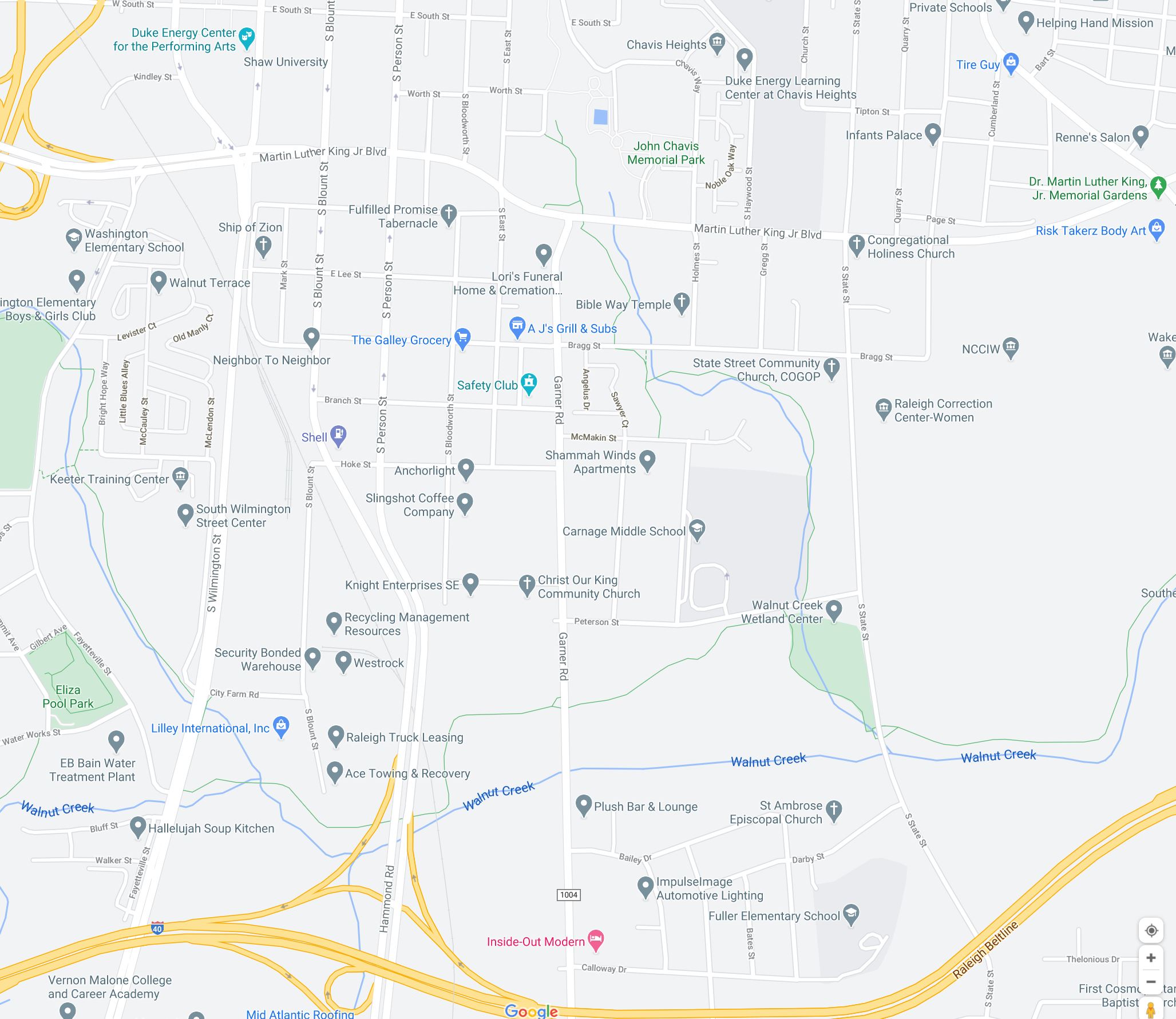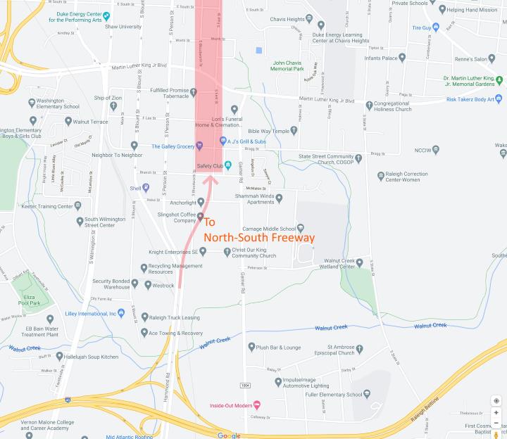 Notice how Hammond Road awkwardly curves to the west, away from the Bloodworth and East blocks and instead connects to the one-way pairs of Blount and Person.