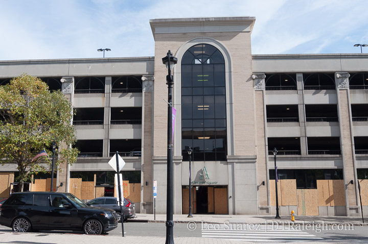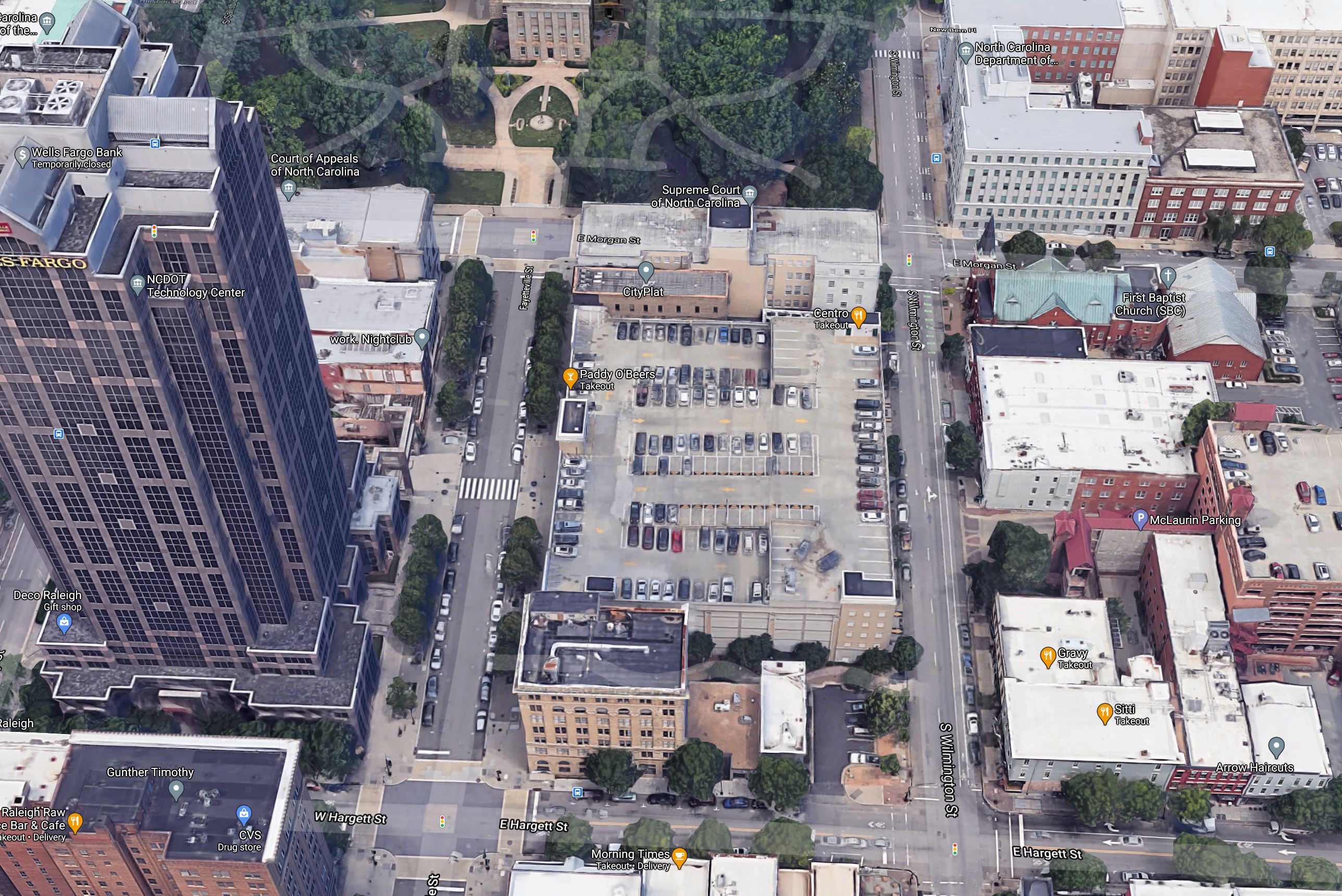 The site of the project currently has the Alexander Square parking deck. The deck is located on the northern end of Fayetteville Street and is a privately owned structure with retail spaces along Fayetteville and Wilmington Streets. There are about five-stories of parking with a mix of public spaces and monthly reservations.
