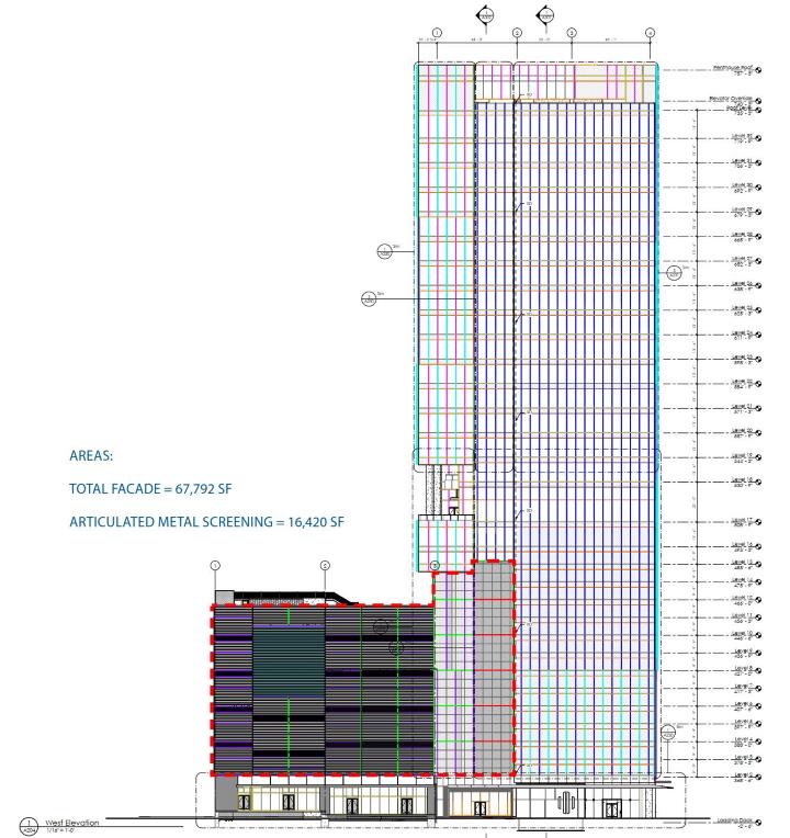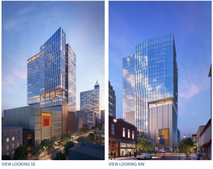 The submitted plans and renderings suggest that all or a portion of the Alexander Square parking deck will be removed. The new tower won’t occupy the entire footprint of the property as the southern half will consist of the tower with parking occupying the lower floors of the entire site.