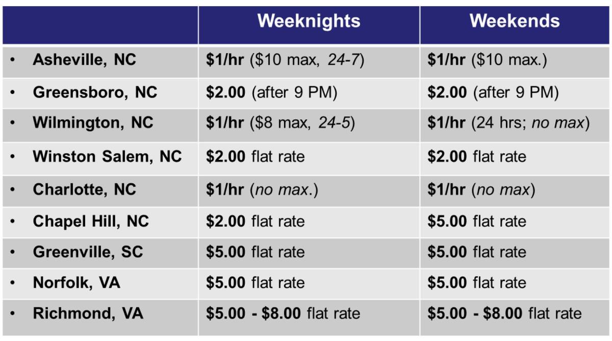 Here is a breakdown of some nearby cities and what they charge in downtown on nights and weekends.