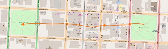 One last thought about this new perspective, kind of a “big idea” as the downtown plan likes to encourage, is that with a little planning we could almost create a pedestrian-only corridor between Moore and Nash Squares. What would it take to walk from Moore Square to Nash Square without using any sidewalks?