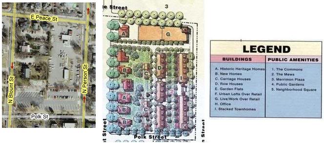 The overall plan is shown in the following map. It includes revitalization of the historic homes along Blount St., filling in the empty lots with new homes, and selling them all to be used as residential rather than commercial. The area will also be filled with dense development including row houses, carriage houses, and flats. Some of the denser developments will include 3 or 4 story mixed-use buildings with on street retail. Wilmington and Peace St. will include the densest developments. I’ve also included some of the building renderings below.
