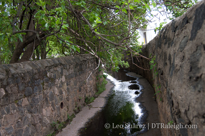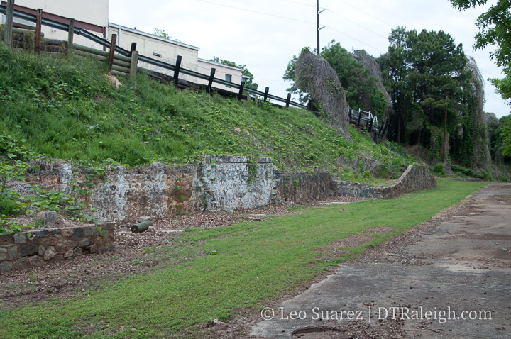 Here are some observations from a walk along Peace Street, specifically underneath the new Capital Boulevard bridge. The photo above shows the old bridge, on the right, and the new bridge, on the left. You can see with the upgraded design that a lot of space is reclaimed when you compare the old “rock mound foundation” versus the “concrete wall foundation” of the new. (like my technical terms?)