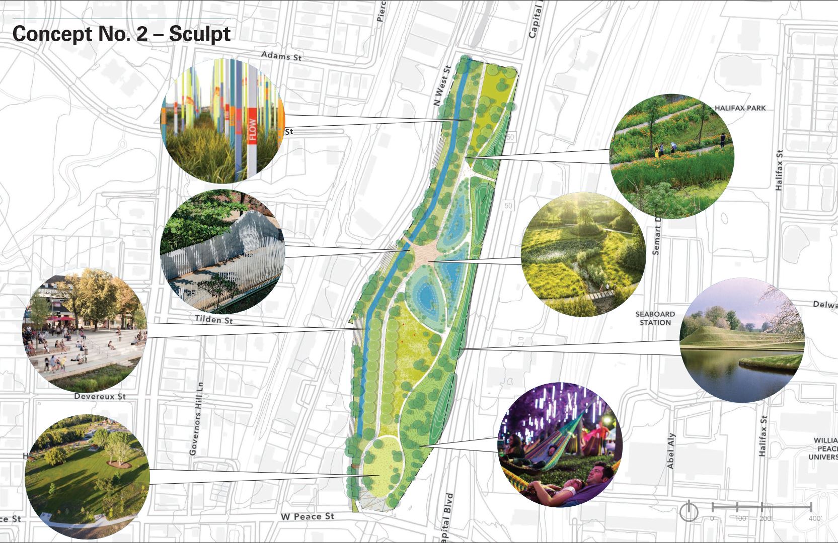 The Sculpt concept is the “middle” option, for lack of a better word, as this one has some work being done to the stream and the cost is in-between the other two. This plan opens up the creek a bit as that concrete cap on the southern end is removed. The creek “is restored in place, with increased stream bench and instream structures for greater habitat and flood capacity and bedform diversity.”