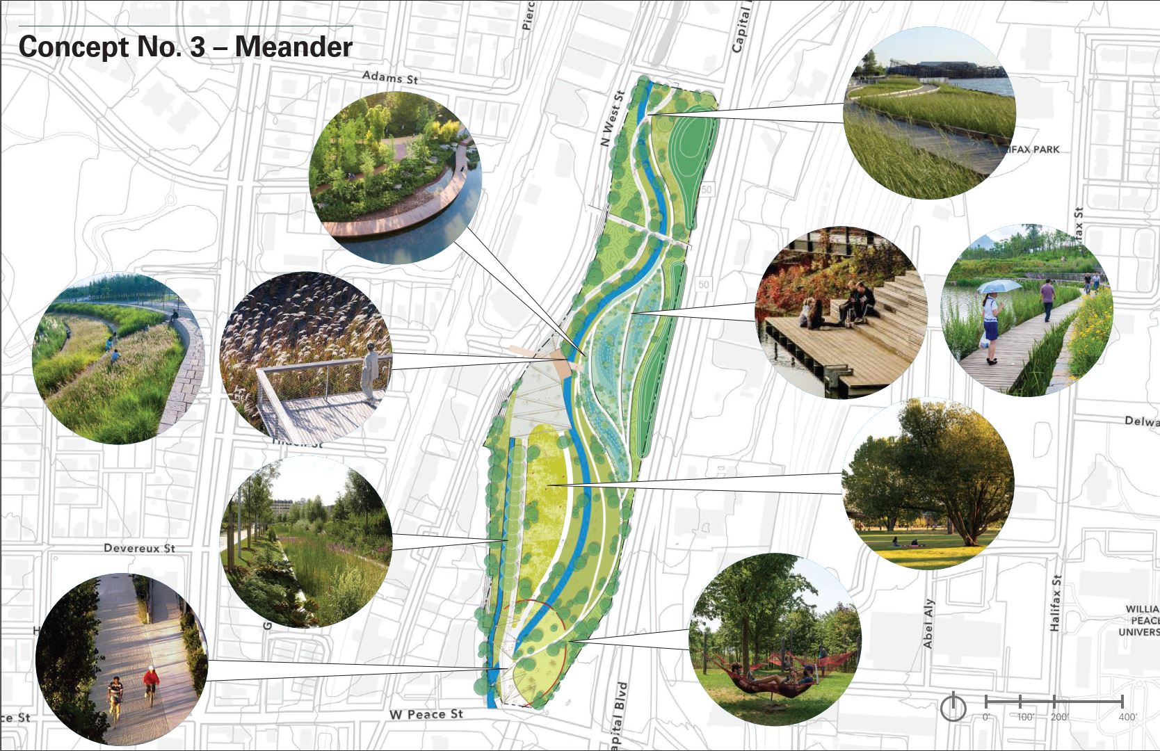 Meander would offer the most significant transformation. As you can see, the stream is practically reconfigured on the site and would offer flowing walking paths alongside. In this plan, “Pigeon House Branch is realigned, with stream and floodplain designed to maximize floodplain connection, habitat health and visitor interaction.”