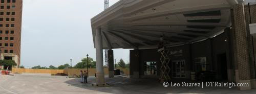 Obviously with the parking deck construction, this block is pretty one sided and is dominated by the new Marriot Hotel. There are three elements to the sidewalk; two food shops and the hotel lobby roundabout. The smaller space is occupied by a Starbucks and by the looks of it, it is pretty much ready to go. The much larger space is going to be a restaurant, named Posta, which runs almost the complete length of the hotel. Pedestrians have one access directly into Starbucks or another to the lobby and into Posta. Car access to the roundabout is by Fayetteville St. only. It appears that there is a very wide pedestrian access to Salisbury, and the convention center, between the hotel and BB&T.