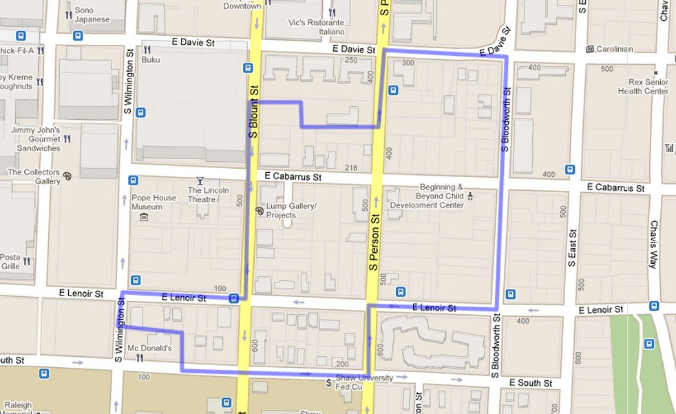 At the meeting yesterday, Will Allen of the Raleigh PRTF went through a brief presentation on the transit mode and route through downtown that they recommend. They agree with Triangle Transit’s preferred vehicle, that being “rail cars electrically powered by overhead wires”. Their route recommendation for the downtown Raleigh portion of the light rail piece is what they refer to as plan D6A.