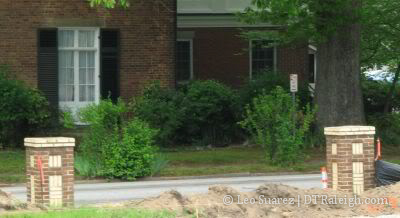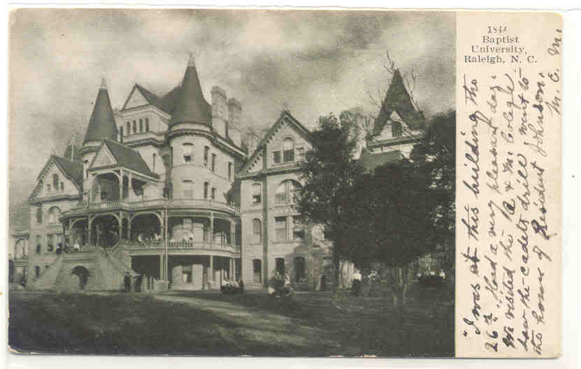 In the 2009 post linked to earlier, commenter Karl points out that this site contains the brick pillar entranceways of the former Baptist University for Women (BUW). Eventually, the university became Meredith College before moving to a new site to the west in 1925. After that, the building became the Mansion Hotel up to 1951. For a great writeup as well as some phenomenal pictures of the building, jump over to Goodnight, Raleigh at the link below: